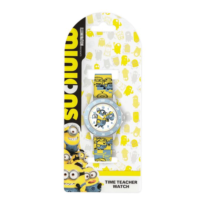 Universal Studios Minions Silicone Strap Time Teacher Watch. Featuring a printed character strap with time teacher hands, easy ready numbers and bezel detail. Packaged on a branded backing card and comes with one year guarantee.